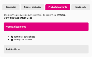 Each product page includes a dedicated Product documents tab alongside the product description and attributes.